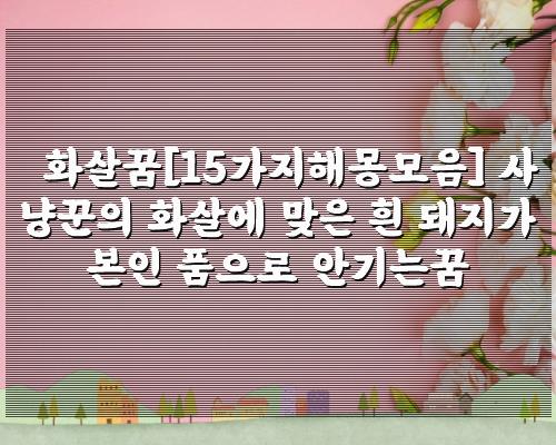 상단 정리드린 해몽은 화살꿈[15가지해몽모음] 사냥꾼의 화살에 맞은 흰 돼지가 본인 품으로 안기는꿈 입니다. 꿈해몽 찾으셨던분께 조금이라도 도움이 되셨으면 합니다.